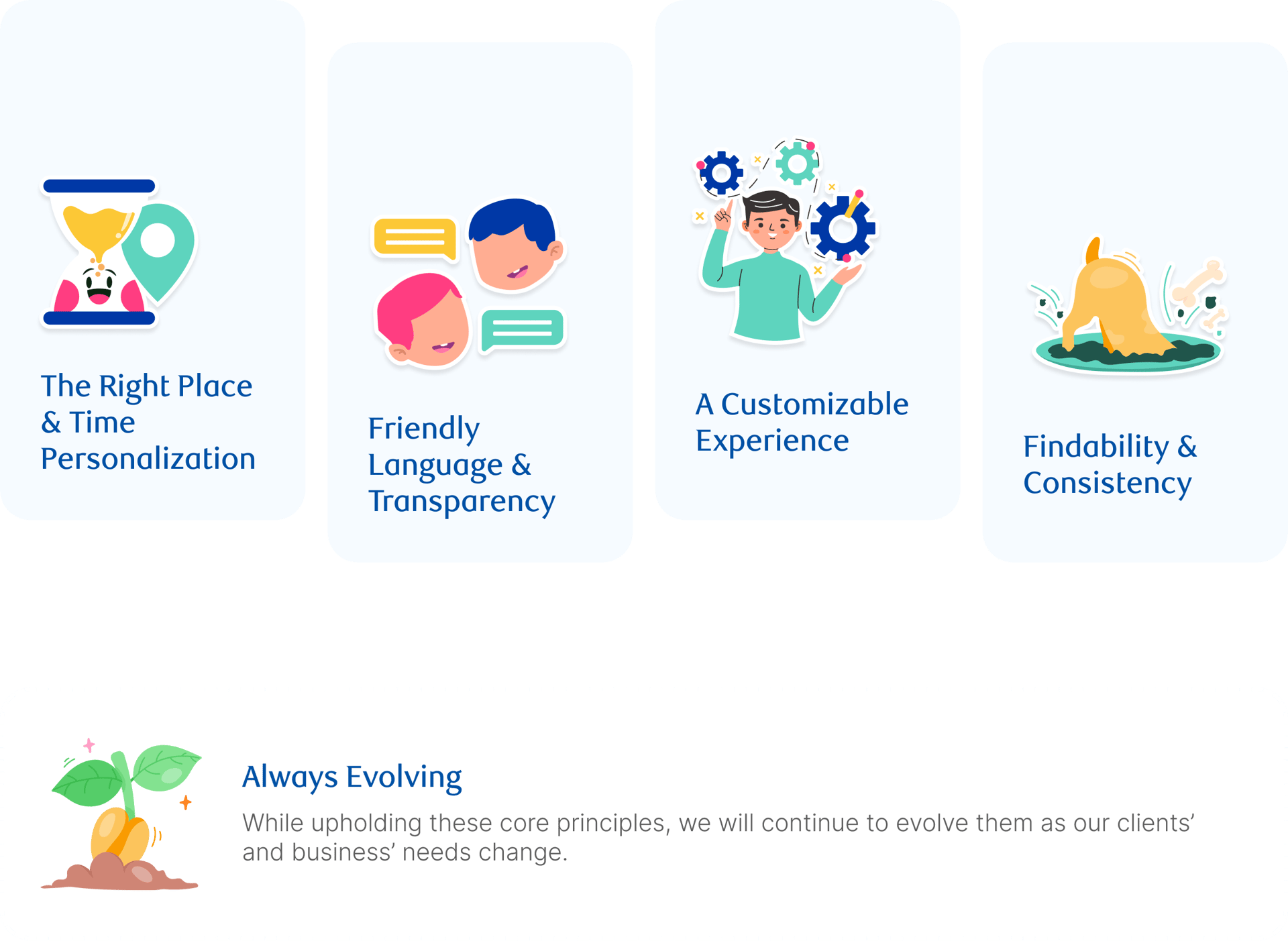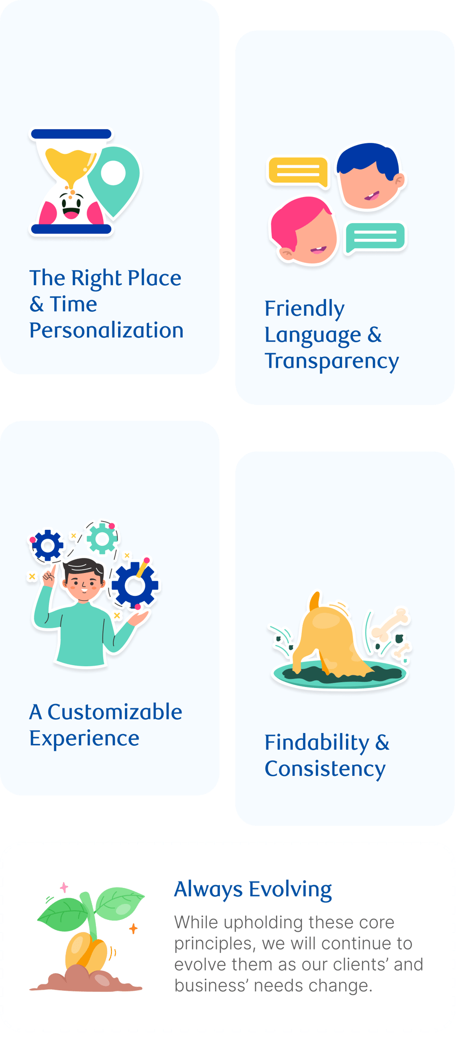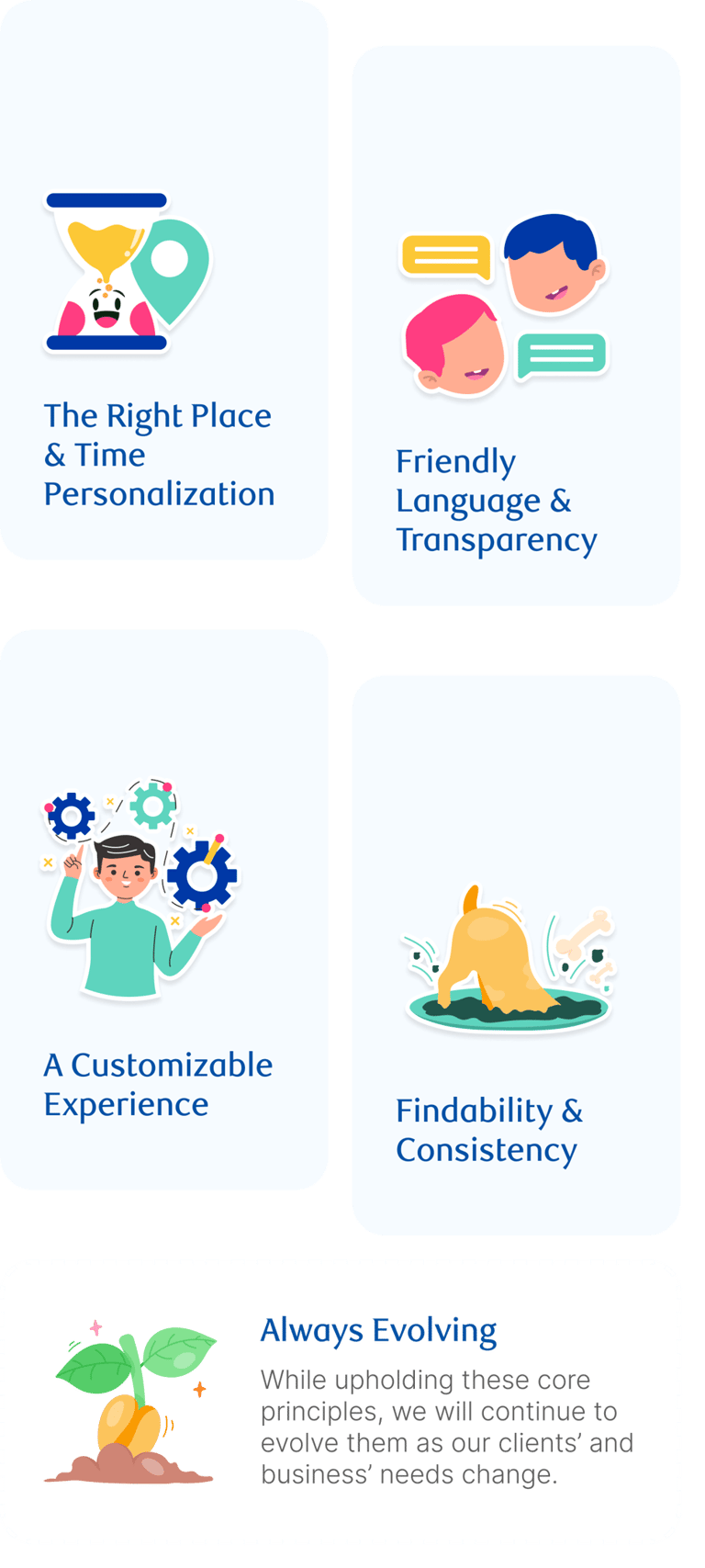 Based on the interviews and research insights, we created the following guiding principles on how to approach financial offers -- initially in the app, aiming to scale to organization-wide: