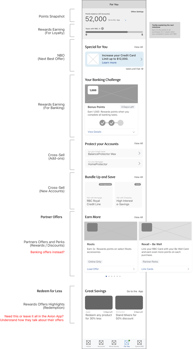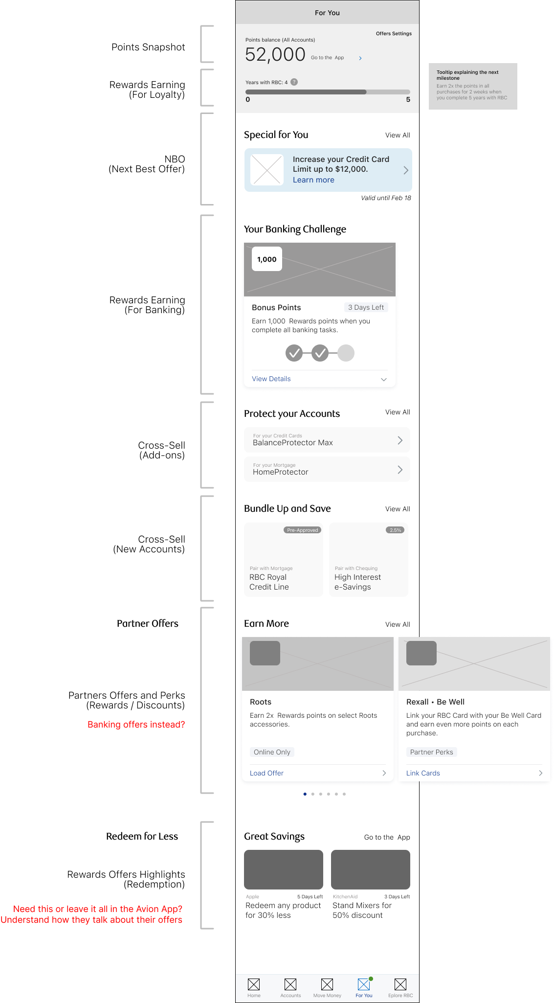 As the Lead Interaction Designer, I partnered with other Product and Content Designers, Engineers, Researchers, and my Senior Manager to contribute to a long-term vision and strategy for offers in the mobile app, using a visual framework to communicate it across RBC.